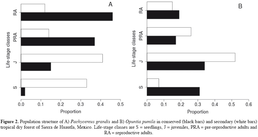 Population size structure is affected by recruitment and mortality rates. For cactus species, population size structure is frequently an uneven distribution of individuals in the different size classes (see Appendix 1 in Godínez-Álvarez et al., 2003). The uneven population size structure is associated to events of recruitment in pulses favoured by the occasional coincidence of some suitable biotic and abiotic conditions, as rain, temperature, low herbivory and/or presence of nurse plants (Godínez-Álvarez et al., 2003). A couple of studies in the dry forest have revealed that cacti show an uneven size distribution (Contreras and Valverde 2002; Méndez et al., 2004). Other studies, also in the dry forest, have shown a decreasing number of cactus individuals with size (Ferrer-Cervantes et al., 2012; Valencia-Díaz et al., 2012) which is related to constant regeneration and lower mortality of adults (Godínez-Álvarez et al., 2003). Irrespective of population size structure, neutral effect of disturbance on size structure of cactus species have been reported (e.g. ureta and Martorell, 2009). However, given that cattle may step on smaller life-stage classes (del Castillo, 1987), regeneration of cacti in arid environments may be reduced and thus, individuals reaching adult stage may be fewer compared to habitats experienced undisturbed succession. Therefore, chronic anthropogenic disturbance in older secondary forest may result in an overall size structure similar to the one in the conserved forest but with a lower proportion of individuals from older life-stages.