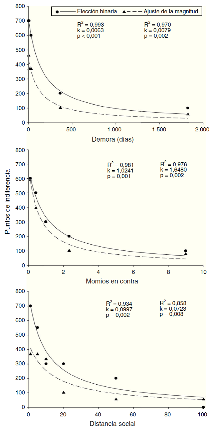 donde y es el valor subjetivo estimado de la recompensa, A es el valor real de la recompensa, X es la variable independiente (i.e., la demora, los momios en contra de la entrega de la recompensa1 o la distancia social) y el parámetro k representa la tasa de descuento del valor de la recompensa. Una tasa de descuento relativamente grande refleja conducta impulsiva, de aversión al riesgo o egoísta, según sea el caso. Por el contrario, una tasa de descuento relativamente pequeña indica mayor conducta autocontrolada, propensa al riesgo o altruista —cf. Green y Myerson (2004) para una revisión sobre descuento temporal y probabilístico, y Rachlin y Jones (2007) para una revisión sobre descuento social—.