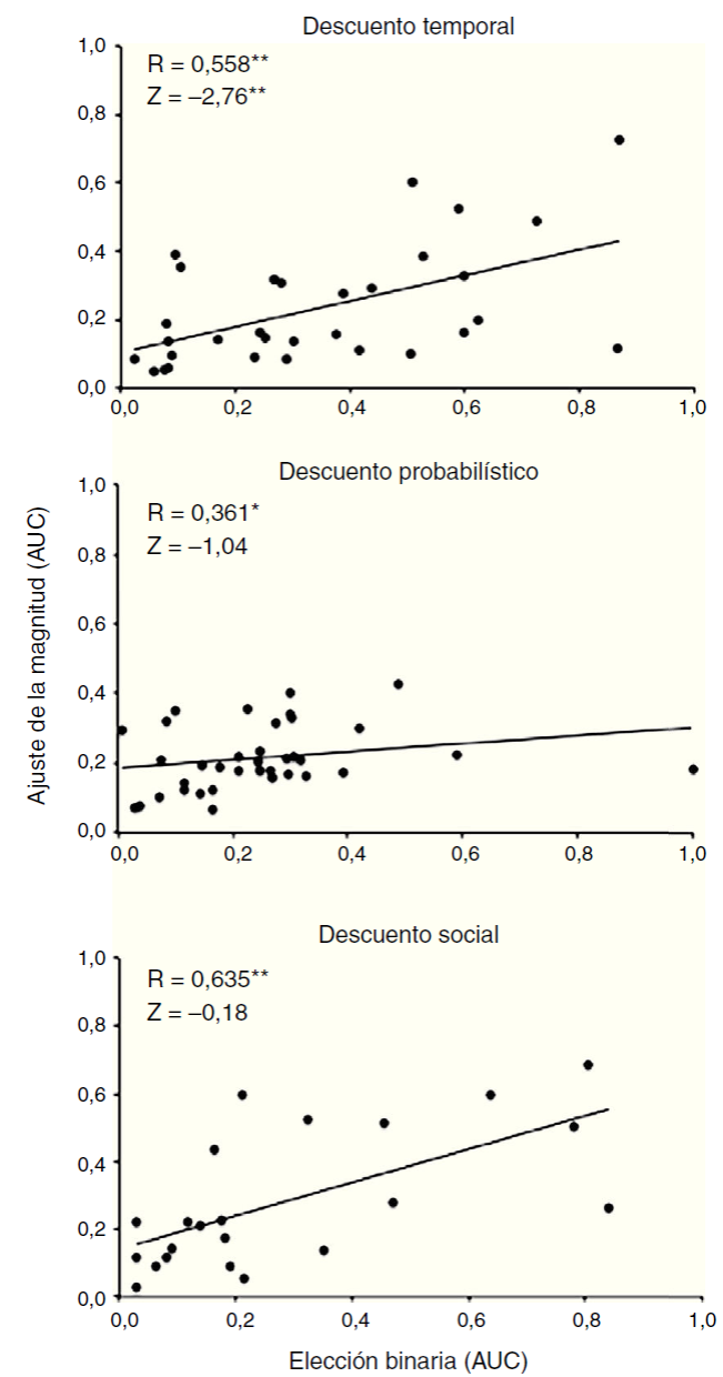 Figura 2 Correlaciones Spearman y pruebas de suma de rangos de Wilcoxon entre los 2 métodos, elección binaria y ajuste de la magnitud, con los 3 tipos de descuento. * p < 0.05 ** p < 0.01