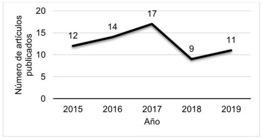 A partir de los 63 artículos identificados por medio de Scopus durante el periodo 2015 a 2019, se encontró que el promedio de publicaciones fue de 12.6 artículos por año (véase figura 1).