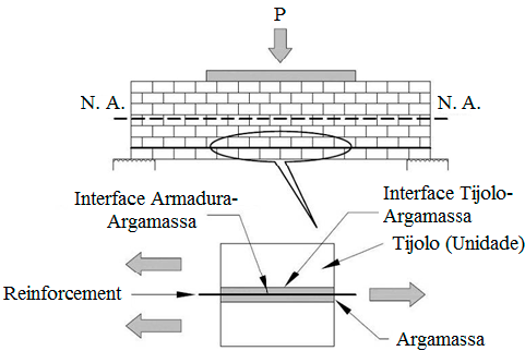 A resistência da alvenaria reforçada é influenciada pelas interfaces entre tijolo, argamassa e armadura. O protocolo experimental foi definido para caracterizar o comportamento de juntas de alvenaria de tijolo armado, com aço embutido em argamassa de cimento 1:6. Isto é aplicável para baixa resistência, com tijolo de baixa rigidez. Investigações experimentais mostram que a ligação entre a alvenaria e o aço não é perfeita. Considerando os mecanismos de ligação críticos, é feita uma tentativa de apresentar uma nova abordagem para o desenvolvimento de um elemento de pseudo interface representando três materiais diferentes (tijolo vizinho, argamassa e armadura) e duas interfaces (interface argamassa-armadura (RM) e interface tijolo-argamassa (BM)). Os princípios de projeto clássicos de concreto armado (RC) podem, portanto, ser diretamente aplicados à alvenaria armada com a introdução do elemento de pseudo interface proposto.