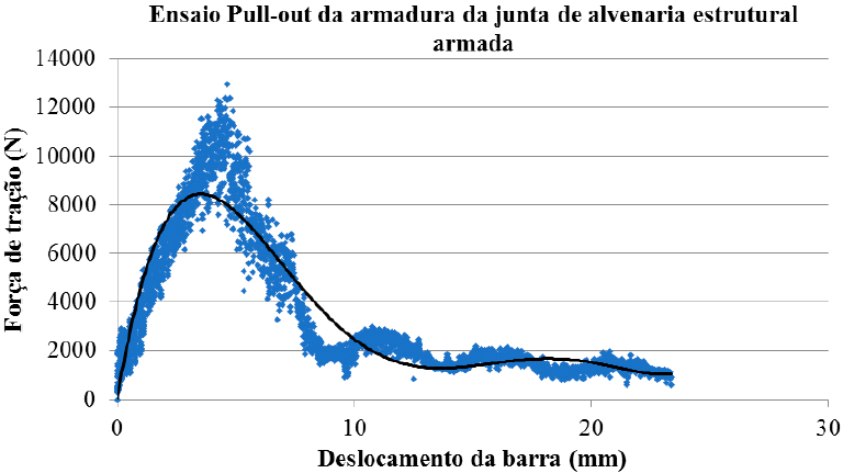 A Figura 3 mostra o gráfico da força de pull-out vs. deslocamento da armadura. Observa-se que a força de pull-out varia com o deslocamento da barra de armadura quase linearmente até ao valor máximo de força, depois disso, o escoamento/deslizamento é observado à medida que aumenta o deslocamento. Pode-se notar que existe alguma capacidade de adesão residual devido ao efeito de fricção da camada superficial. Observa-se a partir destes experimentos que a capacidade de adesão residual é uma função da pressão de confinamento. Como as propriedades da unidade de alvenaria não são consistentes, mesmo em um único lote, um número de 20 ensaios foram planejados para obter resultados representativos e confiáveis.