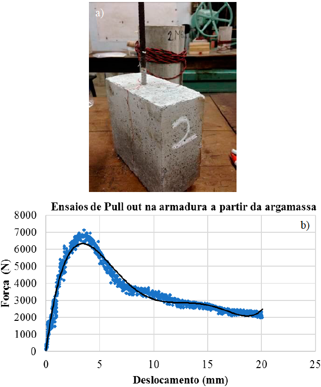 Foi realizado o ensaio de extração da armadura da argamassa utilizando o conjunto de ensaios anteriormente descrito. O tamanho da amostra utilizada foi o mesmo que o da montagem (160mm x 200mm x 90mm), com a armadura inserida no centro. Este ensaio é utilizado para determinar as propriedades da interface de argamassa de armadura. A pressão de confinamento de 0,5 N/mm² é aplicada usando parafusos de tensão. A Figura 4 mostra o gráfico da força de pull-out na armadura vs. deslocamento.
