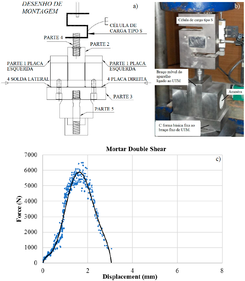 Figura 5 (a) Esquema de preparação do ensaio de cisalhamento de argamassa, (b) fotografia atual (c) Resultados.