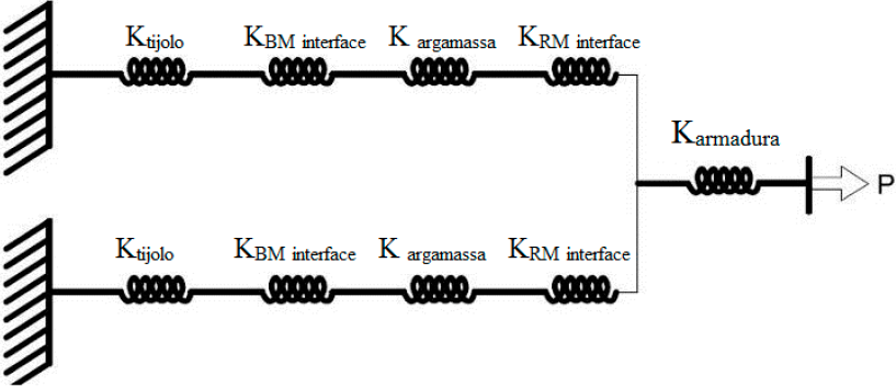 Uma idealização usando a analogia da mola foi apresentada para simplificar a complexidade devido à contribuição de cinco elementos da montagem. A força de pull-out permanece constante em todos os elementos e a deformação é função da resistência oferecida pela armadura, interface de argamassa de armadura, argamassa, interface de argamassa-tijolo e resistência ao tijolo. Cada parâmetro contributivo pode ser idealizado como molas discretas e todo o conjunto pode ser idealizado como sistema de molas conectadas em série. Assim, a rigidez efetiva do conjunto é uma contribuição da rigidez da armadura, da rigidez ao cisalhamento da ligação RM, da rigidez ao cisalhamento da argamassa, da rigidez ao cisalhamento da ligação BM e da rigidez ao cisalhamento do tijolo. Uma representação esquemática da idealização acima mencionada é representada na Figura 8.
