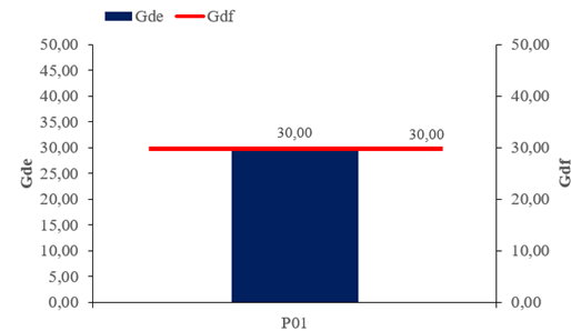 Além disso, nas juntas de dilatação constatou-se a presença de dois elementos que apresentam o mesmo grau de deterioração, porém o grau de deterioração da família é superior ao valor obtido para os elementos individualmente. Dessa forma, pelas formulações matemáticas é possível observar que a influência da repetição de elementos que possuem o mesmo grau de deterioração não representa um aumento tão significativo, uma vez que ela tem como referência o valor máximo, sendo esse valor multiplicado pelo resultado da raiz que envolve o somatório e o valor máximo. A figura 11 mostra o valor de Gdf e os valores de Gde de cada elemento.