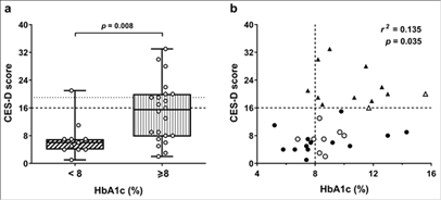 a) Box-plots showing CES-D score distributions in T2DM patients grouped according to their glycemic control (good or poor). Open symbols represent individual CES-D scores. Values on or above the cut-off value of 16 (horizontal dashed line) indicate depression. The dotted line marks a more stringent cut-off value (19) for depression. The p value is from the Mann-Whitney U-test (U=52.5). b) Scatterplot of CES-D scores and HbA1c % values measured in each diabetic patient. Points to the right of the cut-off value of 8 (vertical dashed line) indicate poor glycemic control. Triangles represent patients with depression; circles, patients without depression. Solid symbols are women; open symbols, men. r2 is the Pearson coefficient of determination.