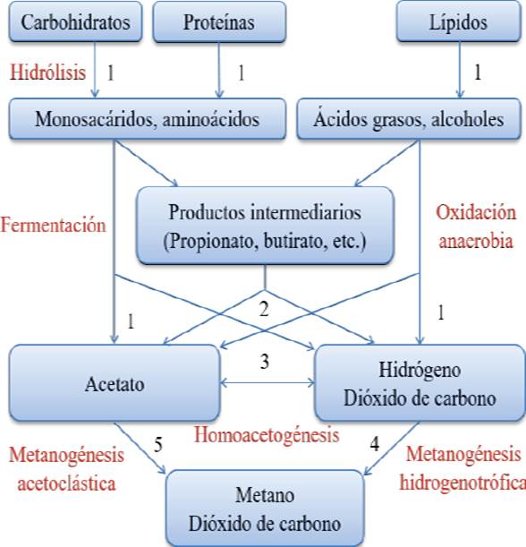La digestión anaerobia de materia orgánica es un proceso bioquímico con reacciones en serie y paralelo, que ocurre por grupos de bacterias fermentativas e hidrolíticas (1), bacterias acetogénicas productoras de hidrógeno (2), bacterias acetogénicas consumidoras de hidrógeno (3), reductores de dióxido de carbono (4) y metanógenos acetoclásticos (5) (Figura 1). Van Lier et al. (2008) describen el proceso de digestión anaerobia que se divide en las siguientes cuatro etapas: