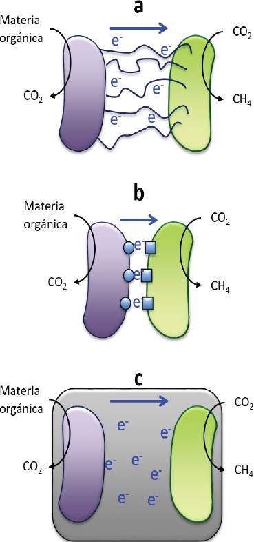 La capacidad de ciertos microrganismos para interactuar en sistemas de transporte de electrones es posible vía pili conductores de electrones (Figura 2a). La DIET, inicialmente descubierta en un co-cultivo de G. metallireducens (bacteria donadora de electrones) durante la oxidación de etanol y con la producción de acetato, que es posteriormente utilizado por G. sulfurreducens (bacteria aceptora de electrones) para reducir fumarato, fue el proceso responsable de proveer los electrones para sustentar el crecimiento de microbiano. Estas especies fueron capaces de formar agregados en donde, aunque no estuvieron en asociación cercana, tuvieron la capacidad de transferir electrones vía pili conductores (Summers et al., 2010). Estudios posteriores confirman que la transferencia de electrones en una biopelícula delgada de G. sulfurreducens es debida a una red densa de pili o nanocables conductores en forma similar a un conductor metálico (Malvankar et al., 2011). La participación de citocromos tipo-C, específicamente el citocromo OmcS, ha sido asociado con pili conductores (Leang et al., 2010) y es importante para la DIET, pues se sugiere que es el responsable de la transferencia de electrones entre pili de diferentes microorganismos (Summers et al., 2010). Un estudio posterior demostró que la DIET a través de pili conductores fue responsable de la producción de metano en gránulos anaerobios colectados de digestores para tratar residuos de la industria cervecera. En los agregados granulares se encontró que especies del género Methanosaeta fueron los metanógenos dominantes y especies del género Geobacter fueron las bacterias metabólicamente más activas, evidenciado por la conductividad en los agregados, en donde los pili conductores fueron los responsables para que ocurriera la DIET (Morita et al., 2011). Co-cultivos con Methanosaeta harundinacea, aislado de un digestor anaerobio y con G. metallireducens, demostraron la capacidad de reducir dióxido de carbono a metano por M. harundinacea (Rotaru et al., 2014).