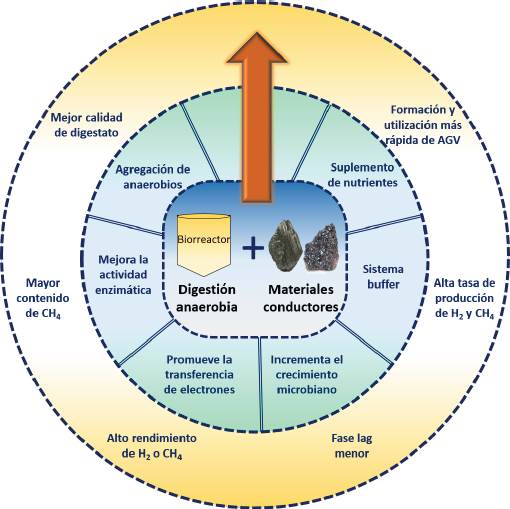 Figura 3 Ejemplo de procesos en los que participan y favorecen los materiales conductores durante la digestión anaerobia y su impacto en la productividad de metano y otros productos.
