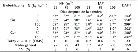 Tabla 2. Número de hojas (NH), índice de área foliar (IAF) y duración del área foliar total (DAFT) del maíz en función del biofertilizante y nitrógeno (N).