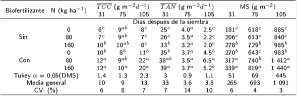 El ANDEVA mostró diferencias significativas para el IAF y la DAFT, debido a la interacción Biofertilizante x N (Tabla 2). En general, se observó que el cultivo sin biofertilizante y 160 kg ha-1 de nitrógeno presentó la más alta respuesta en el IAF y DAFT a los 75 dds. En contraste, el maíz con Biofertilizante presentó mayor IAF y DAFT, con 160 kg ha-1 de nitrógeno.