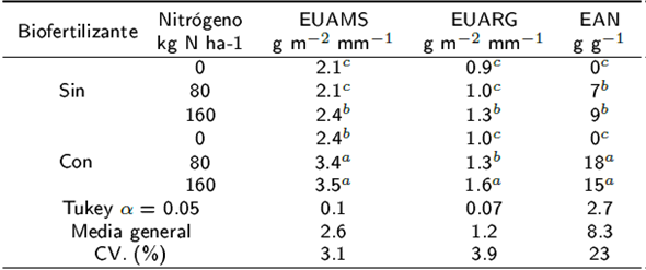 La EUAMS y EUARG mostró diferencias significativas debido a la interacción Biofertilizante x N. La EUAMS más alta se encontró en Biofertilizante con 80 y 160 kg ha-1 de nitrógeno (Tabla 5). La mayor EUARG, se observó con Biofertilizante y con 160 kg ha-1 de N.