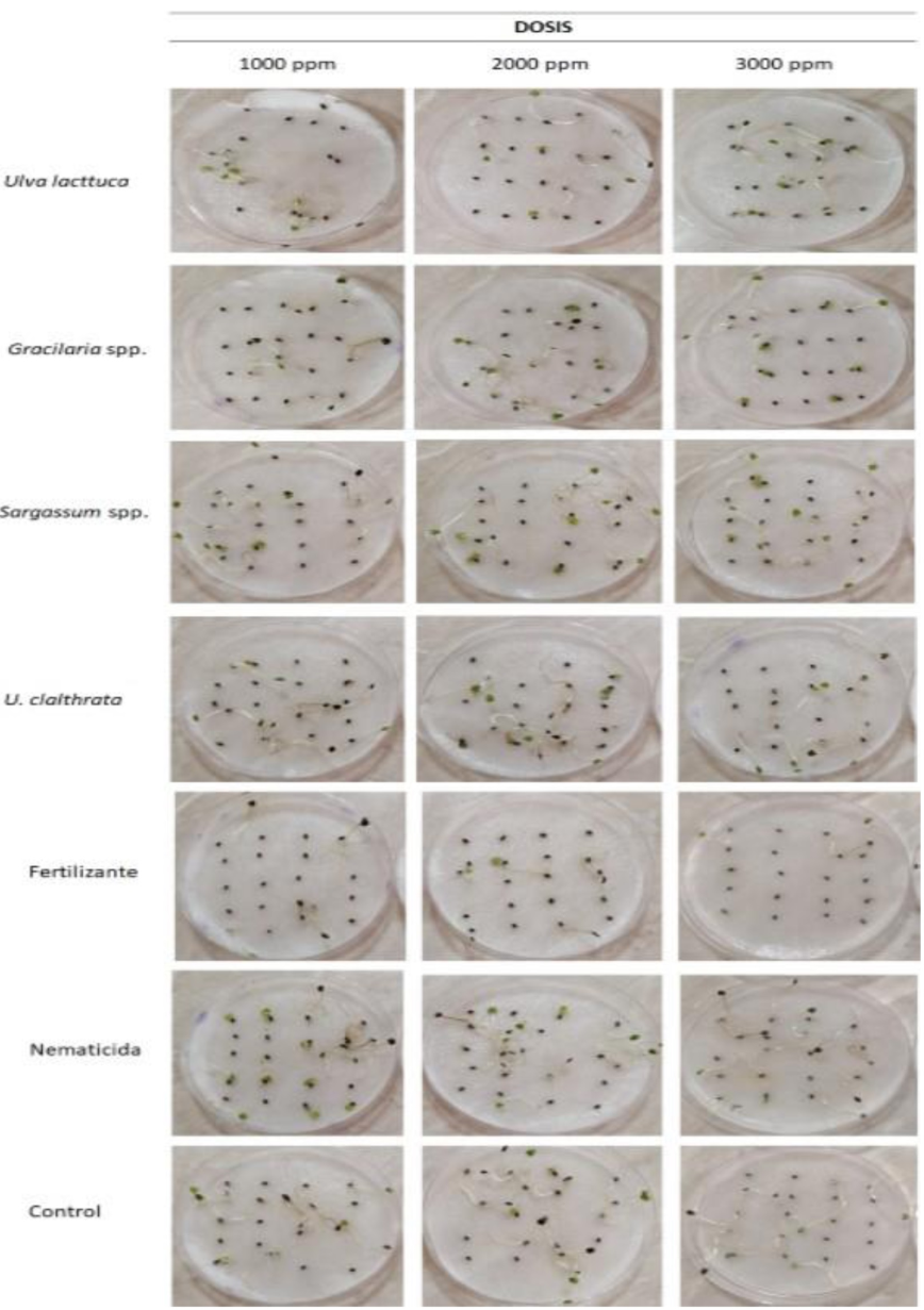 Los resultados mostran que las macroalgas no presentaron una respuesta positiva para la germinación, al verse ésta disminuida o retrasada en la mayoría de los extractos. Caso contrario a lo que señala Santaniello et al. (2017) quienes reportan que los extractos de macroalgas en las plantas mejoran el desarrollo del cultivo y la producción, además de estimular la germinación y aumentar la resistencia a factores bióticos y abióticos. Los resultados, obtenidos, muestran y confirman el efecto que poseen algunas macroalgas como U. Lactuca en la estimulación del crecimiento de las plantas, lo cual coincide con la definición reportada por du Jardi (2015), quien menciona que el extracto de macroalgas es considerado como un estimulante orgánico y natural para el crecimiento vegetal. Debido a que el extracto de macroalgas consiste en una mezcla de sustancias activas biológicamente que actúan sobre el proceso del metabolismo celular de las plantas tratadas que consecuentemente conducen a efectos benéficos en las mismas (Yusuf et al. 2012).
