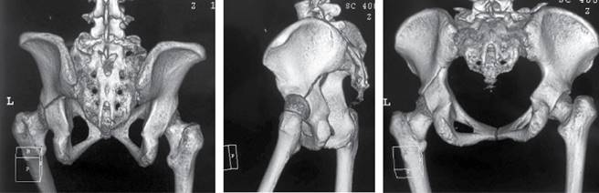 Figura 1: Tomografía axial computada con reconstrucción en 3D, donde se observa trazo de fractura de columna posterior de acetábulo con mínimo desplazamiento.
