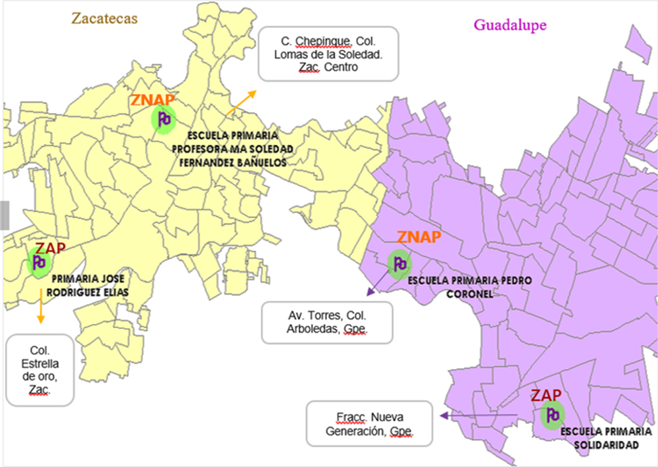 Una vez determinadas ambas zonas y con la información cartográfica de Áreas Geoestadísticas Básicas (AGEBS) y el Catálogo de Localidades de la Secretaría de Desarrollo Social en México (Sedesol, 2010 y 2010b), en la localidad de Zacatecas se ubicaron 23 AGEBS de ZAP, de las cuales se descartaron 18 por no existir escuelas dentro estas, y del resto se dispusieron de cinco primarias. Bajo esta condición, se consideró un muestreo por cuotas, para lo cual, se seleccionaron otras cinco escuelas de Guadalupe, semejantes en matrícula. Cabe señalar que las escuelas en ZAP representaron el 62.5 % del total que aparecen en la zona metropolitana Zac-Gpe. Para el caso de los planteles en ZNAP, también se seleccionaron cinco de cada localidad, bajo criterios de ubicación y matrícula (Tabla 1). A su vez, estas unidades de muestreo se utilizaron para dos análisis de información cuantitativa: 1) exploración socioespacial para identificar oportunidades de promoción del ambiente obesogénico en cuatro escuelas y, 2) publicidad física (anuncios de alimentos y bebidas industrializadas) afuera de las 20 escuelas.