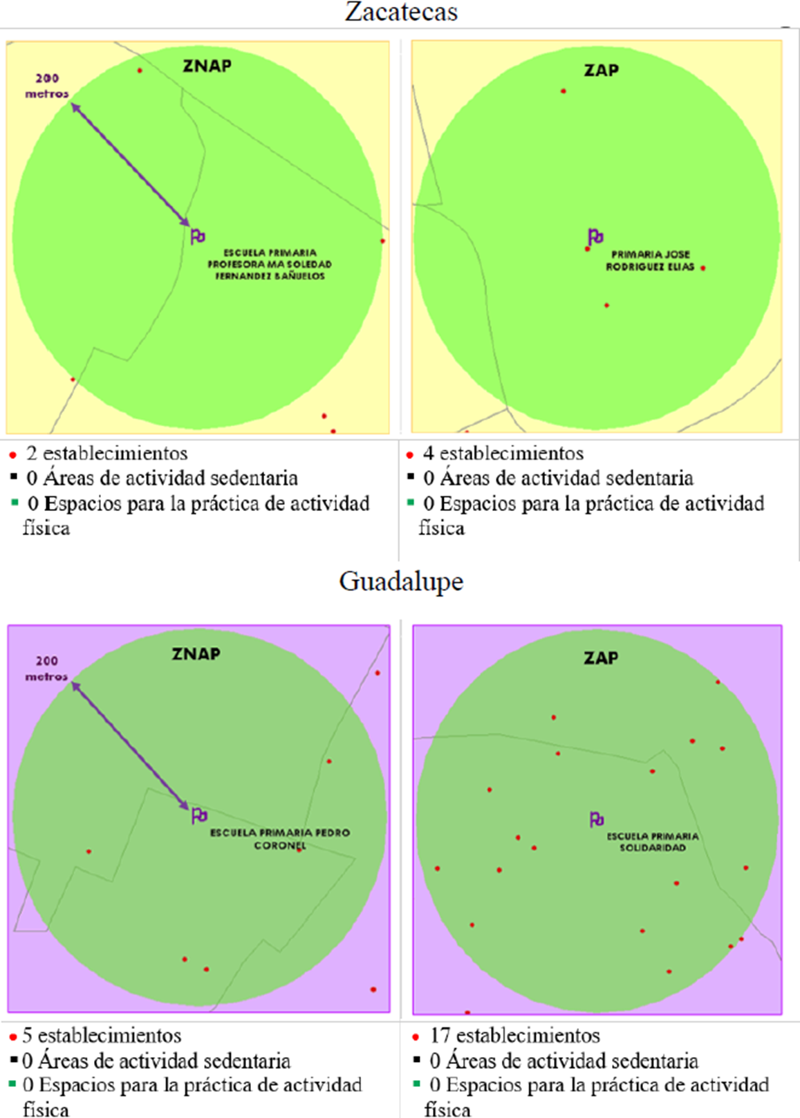 Con base en la simbología de la Tabla 2 se identificaron los tres tipos de características a la redonda -a 200 m- de las escuelas (Figura 2). Para ambas localidades, se encontraron opciones obesogénicas. No obstante, esta situación se profundizó más en Guadalupe, sobre todo en la escuela de ZAP. Se contabilizaron hasta 17 establecimientos dentro del buffer, principalmente tiendas de abarrotes y misceláneas. Respecto a su cercanía, fueron localizados desde los 10 metros hasta los 200 metros. Sin embargo, en las ZNAP, los comercios estaban a partir de los 100 metros, es decir, más distante que en la ZAP.