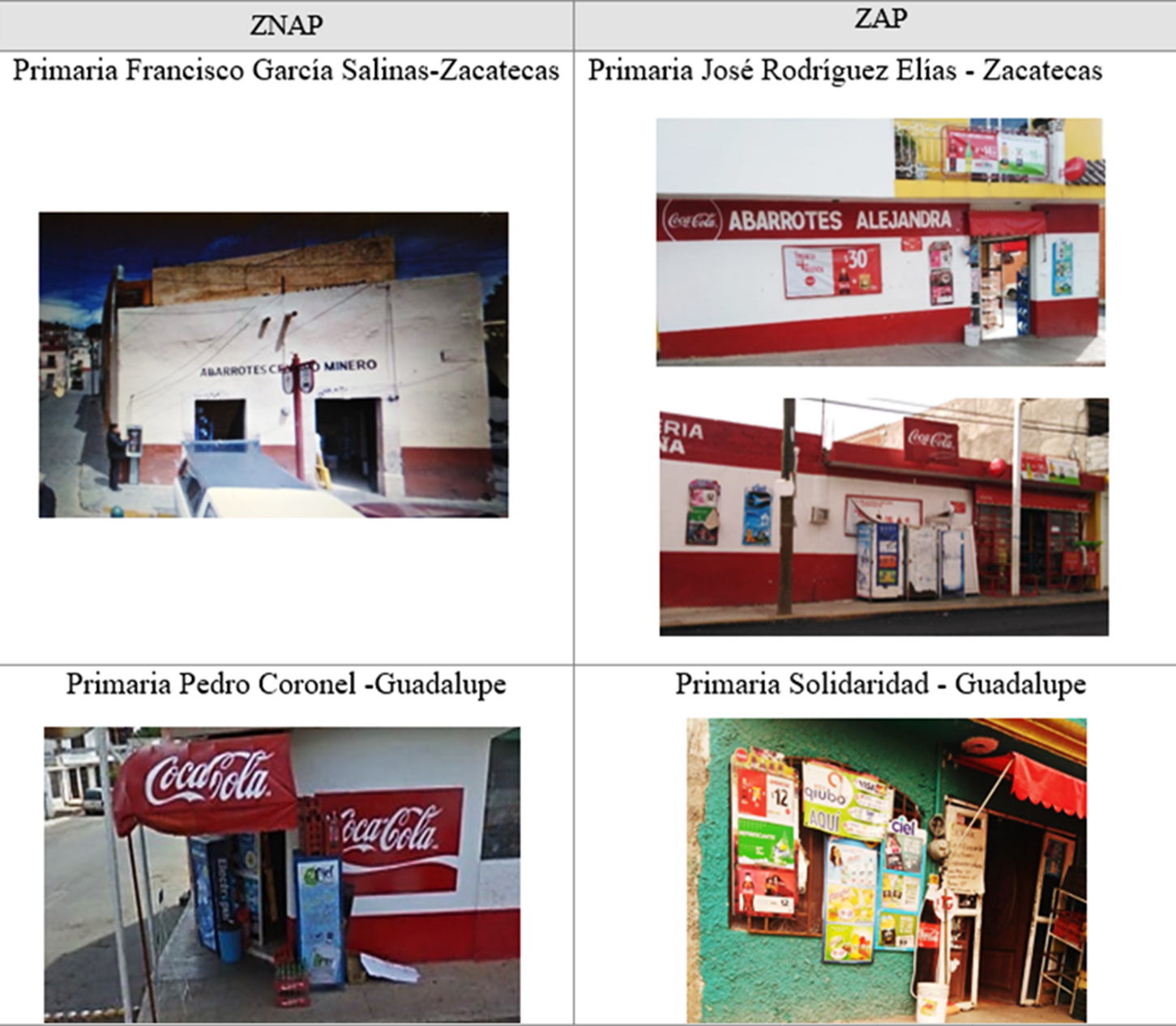 Respecto a la ubicación de áreas relacionadas con servicios de actividades sedentarias, no se encontraron lugares de esta índole, como tampoco espacios al aire libre para la práctica de actividad física y sana recreación. Estas últimas opciones no obesogénicas solo se encontraron alrededor de un buffer de 1,000 metros (1 km) y solo fue en la escuela de Guadalupe de ZNAP. Por tanto, los factores protectores fueron limitados a corta y a larga distancia, además conforme se aumentaba la distancia del buffer -desde 500 a 1000 metros- también aumentaron las opciones de minisúper y sobre todo, de tiendas de conveniencia (Oxxo en su mayoría), tanto en Guadalupe como en Zacatecas. Como complemento se tiene la Figura 3 con imágenes de algunos establecimientos que comparan la cantidad y el tipo de anuncios encontrados alrededor de las escuelas por tipo de zona. Las fotos corresponden a las tiendas localizadas muy cerca de los planteles (justo enfrente de la institución o sobre la misma cuadra), esto es, en donde los escolares pueden llegar caminando. Como se observa, hay evidente diferencia en el número de anuncios publicitarios entre los establecimientos por tipo de prioridad social.