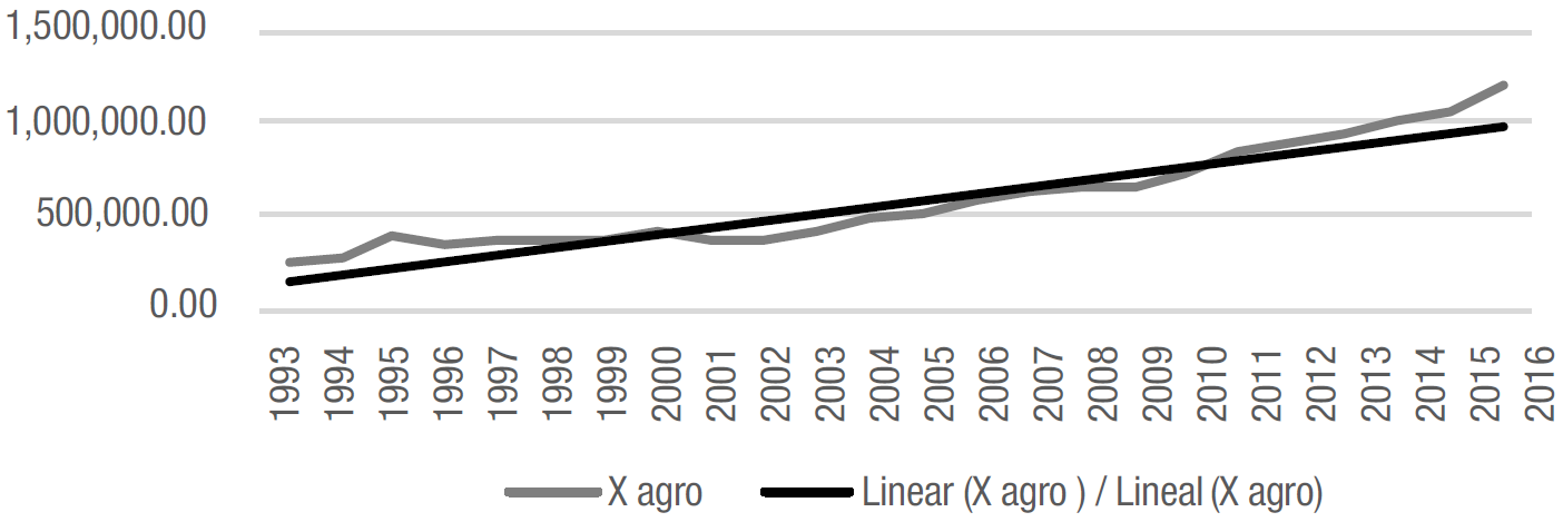 On the other hand, the exchange rate has a smooth positive trend line, that is, the key price in trade policy has depreciated since 1993 and this is recognized by the monetary authority as a significant change for 2016 (Banxico, 2017), which is reflected in the agricultural sector’s surplus (Graph 6). This behavior also occurs in 2017, but cannot yet be classified as a structural change because it is a short period; therefore, the official position that grades the country as a power in agrofood production and export would have to be qualified (Sagarpa, 2018).