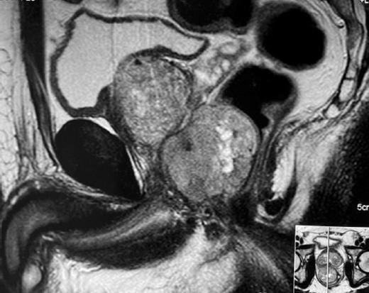 Figura 4 Resonancia magnética de tumor del estroma gastrointestinal rectal que permite apreciar sus relaciones anatómicas en pelvis.