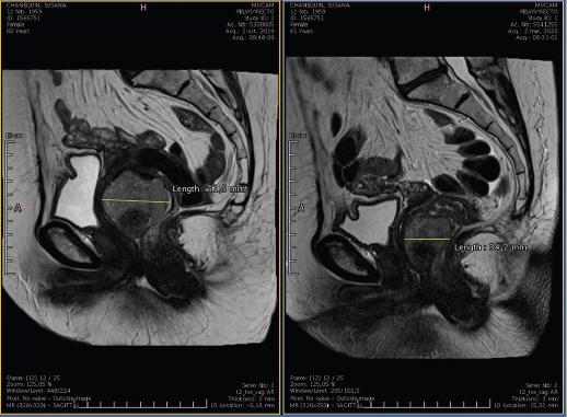 Figura 5 Efectos del tratamiento neoadyuvante en tumor del estroma gastrointestinal rectal, antes (izquierda) y después (derecha) del tratamiento con imatinib, apreciándose una importante disminución del tamaño tumoral.