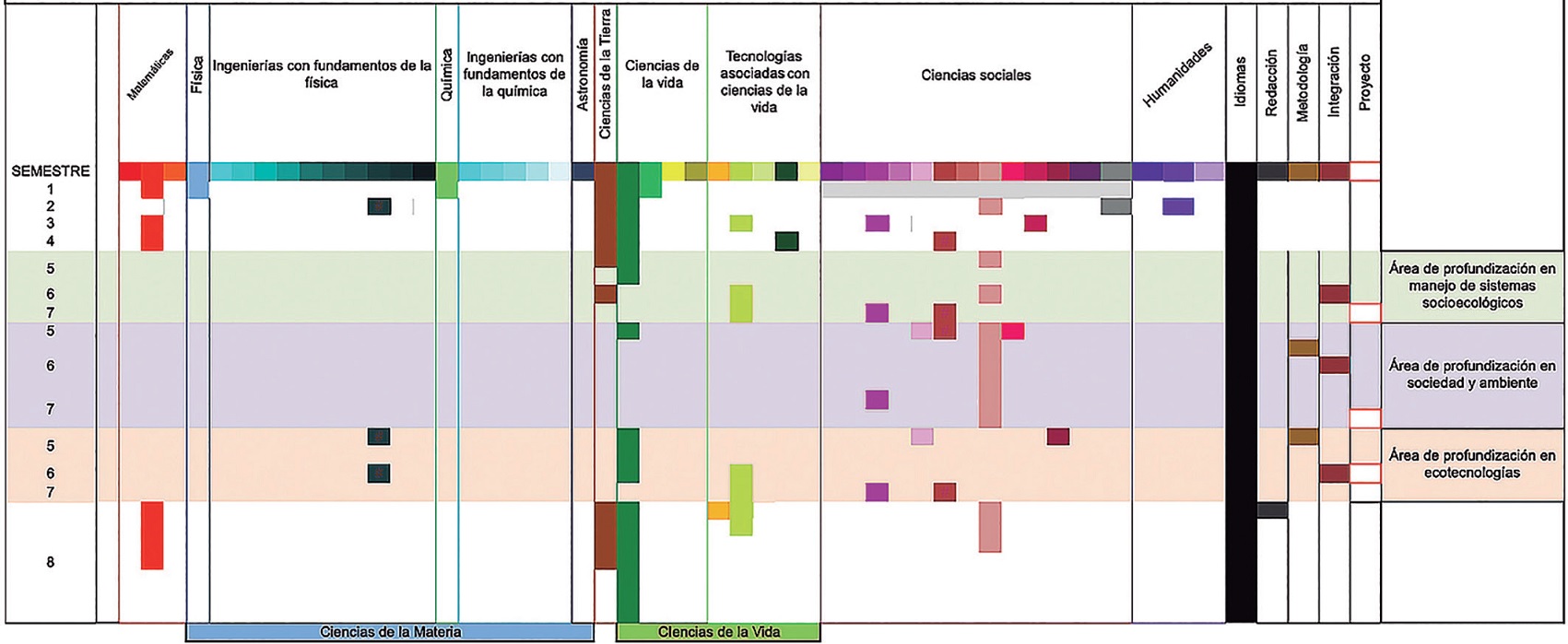 A partir del quinto semestre las asignaturas se imparten conforme a la elección de una de las tres áreas de profundización que siguen a la etapa de formación básica: a) manejo de sistemas socioecológicos; b) sociedad y ambiente, y, c) ecotecnologías.