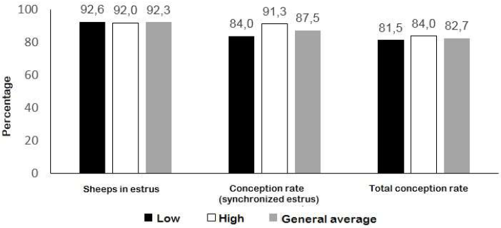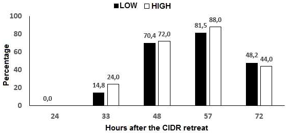Figure 2 Percentage of sheep in estrus, which were synchronized with CIDR and low or high dose of eCG