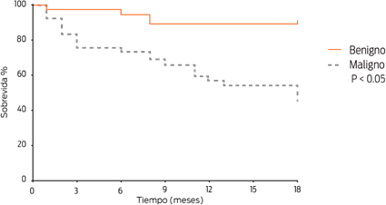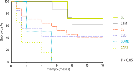 Al analizar por separado la sobrevida de las perras con TMC benigno y maligno, se observó que las pacientes con tumores mamarios malignos tuvieron una sobrevida significativamente menor que aquéllas con neoplasias benignas (P < 0.05) (Figura 3). De las pacientes con tumores malignos, 19/74 (25.7%) murieron durante el seguimiento post-quirúrgico y de éstas, 17/19 (89.5%) murieron días después de la cirugía o en el lapso de un año. Por otra parte, las pacientes con tumores menores a 2 cm tuvieron una sobrevida más larga que aquéllas con tumores mayores a 6 cm, lo que permite considerar al tamaño del tumor como un factor pronóstico importante (P = 0.009) (Figura 4): las pacientes con cars, comd y csd tuvieron una sobrevida corta, menor a 6 meses (mediana de 2, 5.5, y 6 meses de sobrevida, respectivamente), mientras que en las pacientes con CS, CC y CTM, la mediana de la sobrevidad fue de 11 meses (Figura 5).