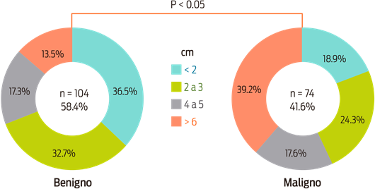El tamaño del eje mayor de las masas tumorales fue muy variado: los de mayor frecuencia fueron < 3 cm (104/178; 58.4%), seguidos por los > 6 cm (43/178; 24.2%) y los de menor frecuencia, de 4 a 5 cm (31/178; 17.4%). También se correlacionó el comportamiento biológico con respecto al tamaño de las masas tumorales, donde se observó una diferencia altamente significativa (χ2 P < 0.05): las neoplasias benignas tendieron a ser < 3 cm y las malignas, > 6 cm (Figura 1).