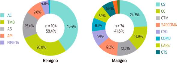 Desde el punto de vista morfológico, similar a lo hallado en este estudio, otros investigadores registraron que los tumores benignos más comunes son el tumor mixto benigno y el adenoma complejo; de los malignos, manifestaron que el más frecuente fue el carcinoma originado de tumores benignos previos, el carcinoma simple y el carcinoma complejo (Im et al., 2014). Por su parte, Ressel et al. (2013) observaron que los adenomas complejos se encontraban entre las lesiones benignas más comunes y los carcinomas simples eran la variante maligna más habitual.
