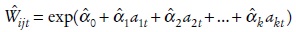 en la que los coeficientes son el peso máximo verosímil de los atributos del individuo y los regresores son los atributos. Ya con los salarios esperados se estima β4* directamente usando la ecuación (9). La estimación econométrica de los parámetros de (12) puede hacerse incluyendo la inversa de la razón de Mills para evitar el sesgo de autoselección. Adicionalmente, si el salario sigue una distribución log-normal, entonces el pronóstico para cualquier individuo debe incluir la constante exp(σ2/ 2)*exp(α0 + α1 a1 + α2 a2 + ...), donde σ2 es la varianza de los residuales.
