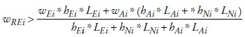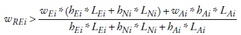 donde R* son las remuneraciones laborales del sector i en el periodo t, los sectores van de i = 1, 2 … n y t = 1, 2,… T. Las W son los salarios o el costo de oportunidad de los diferentes tipos de ocupaciones, L es la cantidad de personas o de horas trabajadas, todo depende de cómo se mida este factor, y los subíndices RE, A, E y N significan remunerado, autoempleado o cuentapropista, empleador y trabajador familiar sin pago, respectivamente.