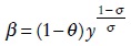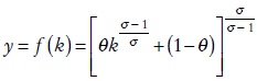 la que Y es el valor agregado, K el capital, A el cambio tecnológico, L el trabajo y σ es la elasticidad de sustitución entre el capital y el trabajo. Dividiendo entre AL para expresar la función de producción en unidades efectivas de trabajo, obtenemos:
