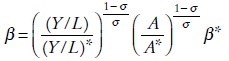 en la que el numerador es igual al producto per cápita, y el denominador es un promedio geométrico del capital per cápita y las horas de trabajo, mismo que puede interpretarse como una medida de acumulación de factores en términos per cápita. Como puede apreciarse en la ecuación, la medida de PTF depende de β.