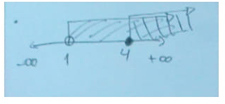 | FPM2: | Claro, bueno en este caso, si estamos trabajando con enteros sería el cuatro solamente, para que no se confundan… [La profesora responsable del curso nuevamente comenta: "Tiene razón él porque aquí, es un intervalo abierto". El FPM2 borra una parte de la solución, dejando solamente el signo de números reales y pregunta a los alumnos] ¿Ya quién? |