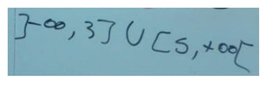 | FPM2: | Al cinco abierto ¿sí?… [El FPM2 corrige el intervalo escrito en la pizarra]. Entonces una forma es que va desde el menos infinito al tres, unido con lo que va del cinco al más infinito; o también puede ser todos los reales menos lo que está entre el tres y el cinco… ¿Se entiende? |
