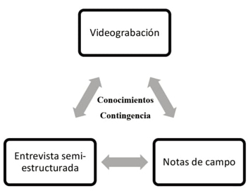 Turner (2012) a partir del análisis de datos de observaciones de clases y entrevistas propone cuatro categorías para analizar los conocimientos disciplinarios y didáctico-disciplinarios visibles durante la gestión de situaciones contingentes (ver figura 1). Usando estas categorías se realiza un análisis del contenido de la información lo que permite llevar a cabo una triangulación, entendiendo esta como un proceso de estudio respecto de un mismo fenómeno, utilizando diversas estrategias para aumentar el grado de validez y hallazgos obtenidos durante la investigación (Benavides y Gómez-Restrepo, 2005). El tipo de triangulación realizado en esta investigación es entre métodos, ya que permite la verificación y comparación de la información obtenida en diferentes momentos. La triangulación en este trabajo (figura 2) está orientada principalmente a identificar los tipos de conocimientos externalizados durante la gestión de aula según los aportes realizados por Turner (2012), como los expuestos durante la entrevista. La triangulación permite validar el proceso de reflexión para complementar las dimensiones de confrontación y reconstrucción (Ciclo de Smyth) de la gestión de las situaciones contingentes.