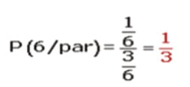 Como quedaría ese ejercicio así… porque me están preguntando calcular la probabilidad de obtener un 6, 1 de 6 y eso va a estar dividido por mi condición A qué me dice que ha salido par y eso que significa que, si sale par, puede ser 2, 4 o 6, en este caso me preguntan por el 6… acá ustedes saben multiplicamos 1/6 por 6/3 por eso que me queda 1/3… la probabilidad es 0,3333…