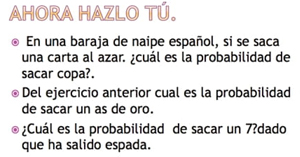 | FPM1: | Ahora se presenta un ejercicio para ustedes. Ustedes saben que el naipe español consta de 40 cartas, a diferencia del naipe inglés, entonces ¿Cuál es la probabilidad de sacar una copa de un naipe español?... Sabemos que… [Los alumnos responden antes que el FPM1 termine de leer el problema] |