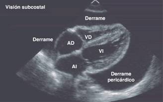 Las manifestaciones clínicas se integran con la tríada de Beck (ingurgitación yugular, hipotensión, disminución de ruidos cardiacos). El electrocardiograma se observará con alternancia eléctrica. En el momento del paro cardiorrespiratorio, es un reto distinguir clínicamente esta entidad, por lo que nuevamente la ultrasonografía E-FAST, el ecocardiograma de emergencia, es de suma utilidad (Figura 4).31