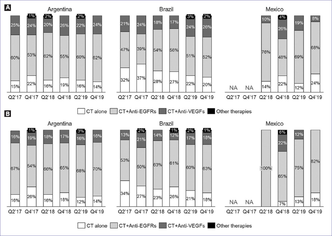Figure 2 Chemotherapy and therapies used in metastatic colorectal cancer metastatic colorectal cancer RASwt patients in first line. The first-line therapy in all mCRC RASwt patients per period in Argentina, Brazil, and Mexico (A); the first-line therapy in patients with the left-sided RASwt mCRC per period in Argentina, Brazil, and Mexico (B); CT, Chemotherapy alone; NA, Not available; anti-EGFRs (cetuximab and panitumumab), anti-VEGFs (bevacizumab).
