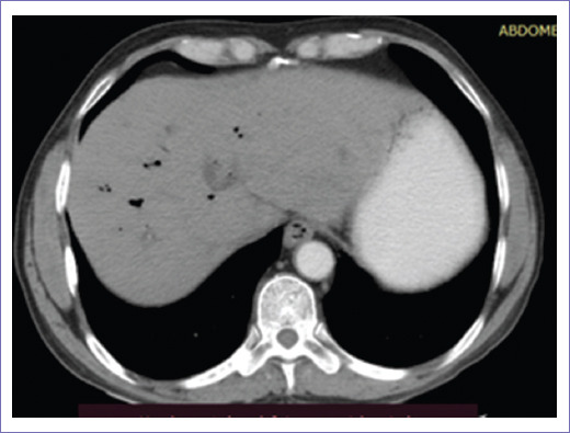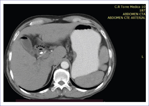La tomografía abdominopélvica simple y contrastada de abril de 2022 reportó vía biliar intrahepática con presencia de gas en su interior de manera generalizada, colédoco con diámetro de 12 mm, prótesis que se extiende hasta conducto pancreático y segunda porción de duodeno, en la porción final se delimitaba engrosamiento focal de 15 mm, vesícula sin litos en su interior, con neumobilia (Figs. 3 y 4).