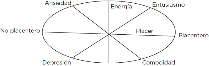 En los estudios seminales sobre bienestar subjetivo o psicológico, Watson y Tellegen (1985) identificaron dos dimensiones afectivas sobre las que se fundamenta el bienestar psicológico, a las cuales denominaron valencia -placer- y activación -energía-. Ambas dimensiones pueden representarse en un plano cartesiano, en el cual los autores ubicaron el placer en el eje horizontal, que indica qué tan bien se siente una persona, y la activación en el eje vertical -ortogonal al de placer-, para denotar la movilización o actividad del individuo. Cuando estas dimensiones se juntan en un plano forman el modelo circunflejo del bienestar. El modelo postula que los estados afectivos -sentimientos- pueden localizarse alrededor de la circunferencia de un círculo que se traza en el cuadrante que forman estas dimensiones representadas en los ejes y teniendo como centro el origen (Watson y Tellegen, 1985; Feldman, 1995; Rusell y Carroll, 1999). Estos sentimientos pueden describir el bienestar subjetivo de una persona en términos de su localización en las dos dimensiones. Su intensidad se expresa mediante la distancia que tienen en relación con el origen o punto medio -a mayor distancia, mayor intensidad-. El sentimiento más positivo o negativo, se representa con los puntos extremos al final de las dimensiones de placer y energía (Feldman, 1995). Un alto grado de placer o descontento -la dimensión horizontal- puede estar acompañada por altos o bajos niveles de energía -dimensión vertical-. Una cantidad particular de energía o actividad puede ser placentera o desagradable en varios grados. A manera de ejemplo, podemos identificar como efectos positivos que pueden observarse el entusiasmo, la energía y la alegría. En el lado opuesto, los negativos pueden ser enojo, miedo y nerviosismo. En general, el bienestar subjetivo está basado más en el nivel de placer que de energía (Feldman, 1995).