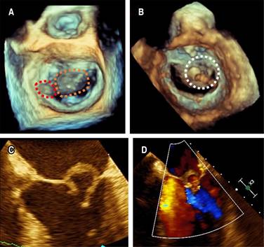 Figure 1: Transesophageal echocardiography: A) 3D view from the left atrium demonstrating an 11 × 5 mm vegetation on the P1 annulus of the mitral valve (red dotted line mark) and an anterior mitral leaflet perforated aneurysm (orange dotted line mark), B) 3D zoom-mode acquisition of mitral valve in mid-diastole from a ventricular perspective with discontinuity of the anterior mitral leaflet at segment A2 (white dotted line mark), C) 2D image at 30o showing an abnormal ring-like structure on anterior mitral leaflet compatible with a perforated aneurysm, D) 2D image with color Doppler showed mitral regurgitation and turbulent flow inside the saccular like image.