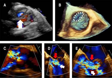 Figure 2: Transesophageal echocardiography: A) 3D image with color Doppler showing flow on the non-coronary cusp of the aortic valve (white arrow), B) 3D image with discontinuity of non-coronary cusp (white dotted line mark), C) 2D image with color Doppler at 125o showing lateral and central jets of aortic regurgitation, D, E) 2D image with Color Doppler at 45o showing the aortic regurgitation jet (white arrow) impinging on the anterior mitral leaflet (red arrow).