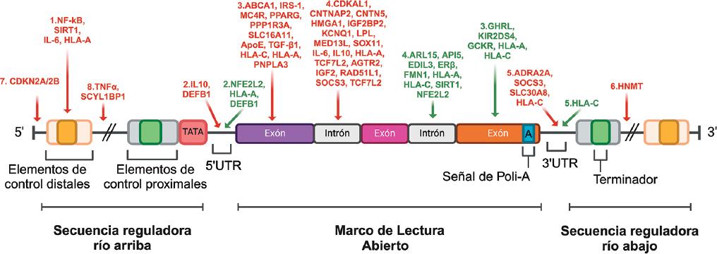 Figura 1 Esquema representativo de la localización de las variantes genéticas del ADN nuclear asociadas al riesgo o protección de la DMT2 y sus complicaciones microvasculares. Las variantes de riesgo (rojo) y de protección (verde) están distribuidas en diferentes regiones de la estructura génica, indicadas por las flechas que señalan las ubicaciones de estas variantes dentro del gen. 1: secuencia río arriba; 2: 5'UTR, región no traducida en el extremo 5'; 3: región codificante (exones); 4: región intrónica (intrones); 5: 3'UTR, región no traducida en el extremo 3'; 6: secuencia río abajo; 7: región intergénica (espacio entre genes); 8: región reguladora. La descripción de cada variante se muestra en detalle en la tabla 1. Elaboración en BioRender.
