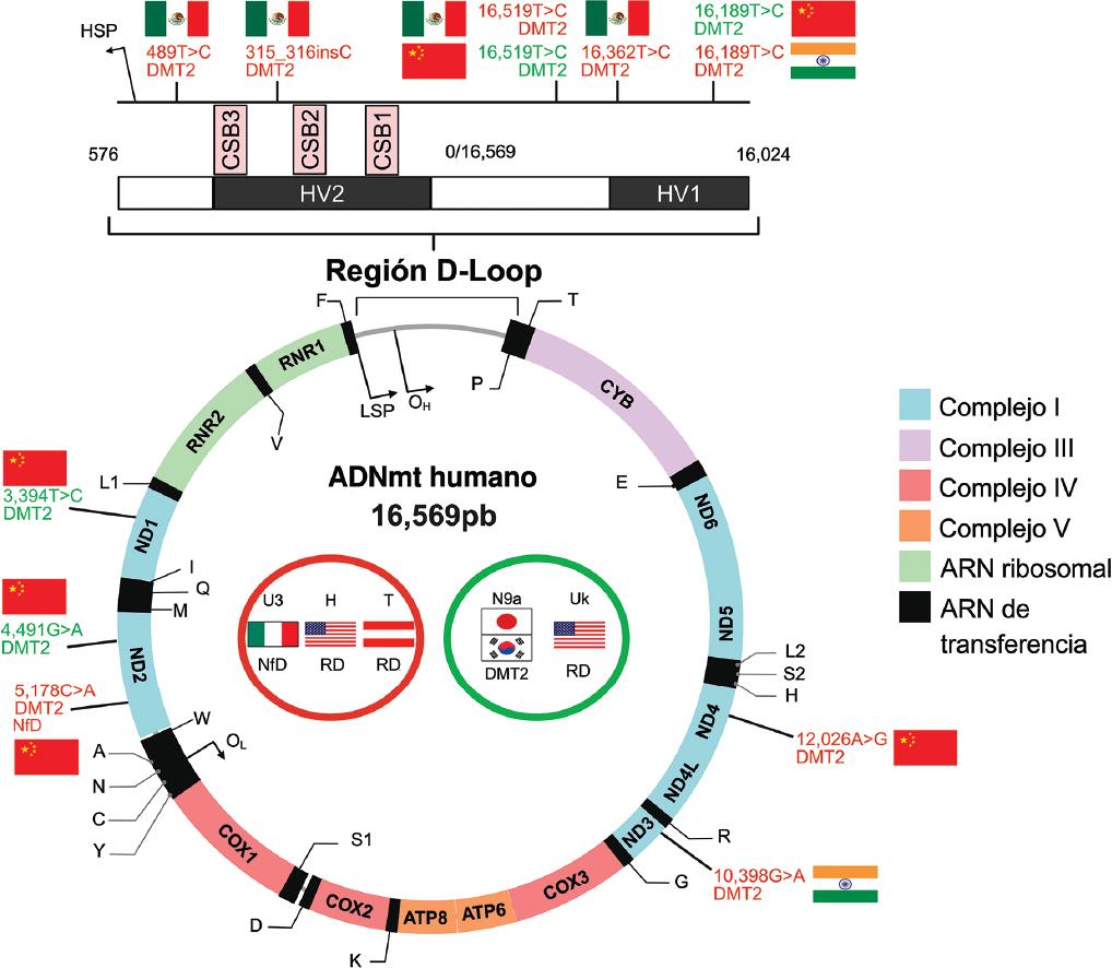 En población mestiza mexicana se han reportado las siguientes variantes de riesgo de DMT2: 315_316insC, 489T>C, 16362T>C, y 16519T>C, localizadas en la región hipervariable del ADNmt.7 En población china se identificaron las variantes de protección 16189T>C y 16519T>C en la región hipervariable.38 Asimismo, se identificaron los haplogrupos mitocondriales de riesgo a DMT2 de protección: N9a en poblaciones de Corea y Japón.42 No se han reportado haplogrupos asociados a DMT2 en población mexicana.