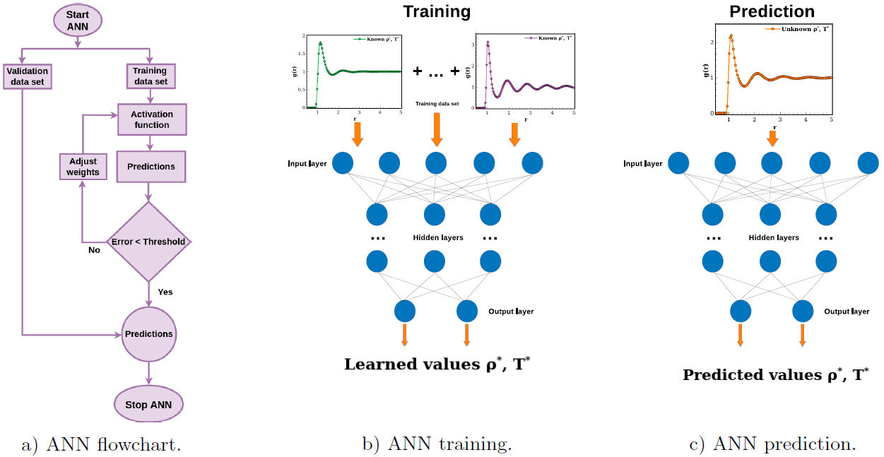 Depending on the particular problem that one wants to solve with an ANN, its architecture must be chosen carefully, since the data processing and final predictions strongly depend on it [28]. Once the ANN architecture is selected, the training procedure starts feeding the ANN with a set of data where the values and functions of interest are well known. Using these data, hidden layers determines compute the weights of a non-linear function [29]. Using this function variables of interest are predicted, then, a comparison with the real values is performed in order to computed an error. If error is greater than a previously established tolerance value, the activation function is computed again using new weights, else, predictions are updated and the ANN training finishes. Additionally, using an independent data set of well known variables, the ANN is used to predict them in order to validate its training. A general flowchart of this algorithm is shown in Fig. 1a).