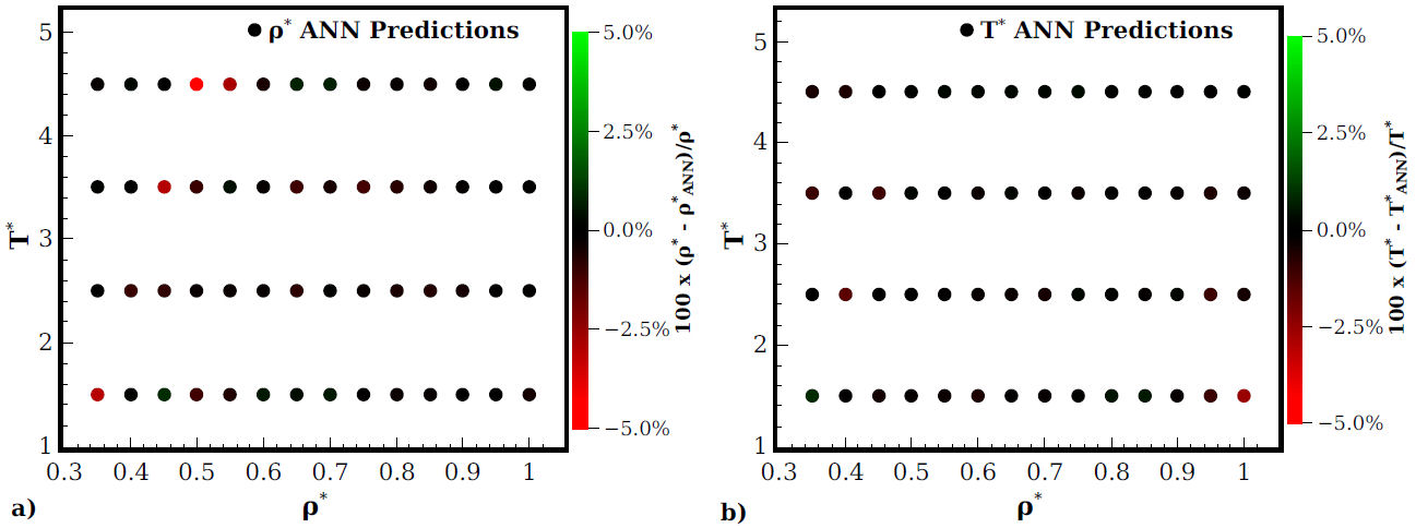 The assessment of the training stage is mainly determined through the mean absolute error (MAE) and the mean squared error (MSE) whose obtained values were 7.7 ×10-3 and 1.4 ×10-4 respectively. Nevertheless, the accuracy of the prediction stage is evaluated individually instead to perform a statistical analysis. This procedure allows us to clearly identify the prediction performance of the ANN at specific thermodynamic regions since we can determine in the magnitude of deviations and identify systematic errors. Then, the ANN prediction accuracy is taken into account through the magnitude of the percentage relative error, defined as 100×(X - XANN)/X, where X stands for the real value of ρ* or T*, respectively. Therefore, XANN is the respective prediction performed by the ANN. This error definition allows us to identify if any individual prediction is underestimated or overestimated through the sign of each result, being positive in the former scenario and negative in the last one.