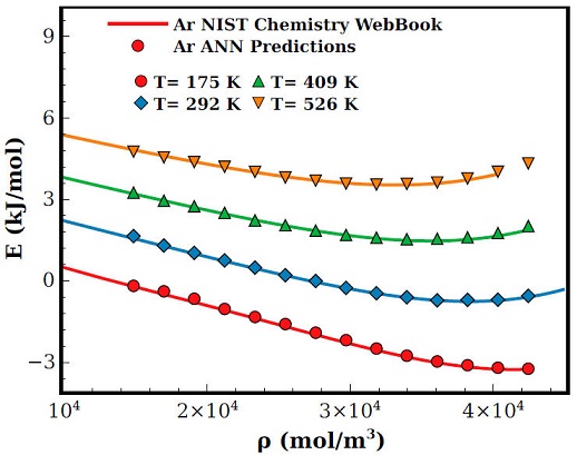 In Figs. 2 and 4 results for pressure and internal energy of Ar are displayed as a function of density for isotherms at T(K) = 175; 292; 409 and 526. As one can notice, both equations of state are in general well predicted by the ANN, nevertheless, as the density and temperature increases the ANN tends to overestimates the pressure, see for example the isotherm T = 526K in Fig. 3. This behaviour can be traced to the slight overestimation of density predictions at high temperatures, see Fig. 2a).